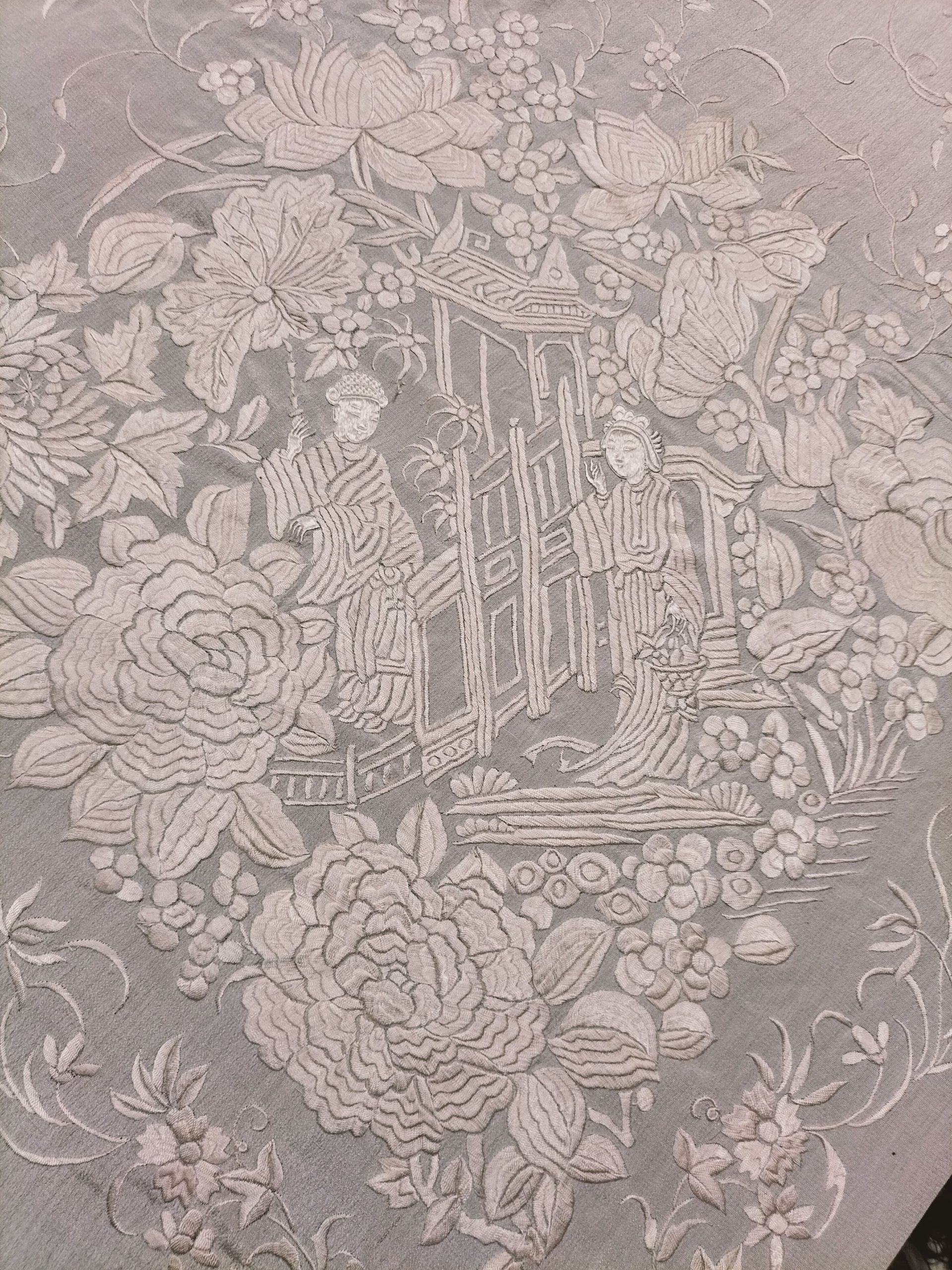 Este es un maravilloso mantón de Manila con diseños de cantones chinos, de gran tamaño y con 2 kg de peso. Las figuras centrales tienen orejas grandes y marcadas, que en la cultura china son símbolo de buena suerte y prosperidad. Además, las cuatro esquinas presentan figuras grandes, junto con otras de tamaño medio distribuidas por todo el mantón. Se pueden observar cambios sutiles en el vestuario de las figuras principales, como variaciones en los colores o el modelo de tocado que llevan. Además de las tradicionales construcciones de pagodas y otros elementos típicos de estos mantones, se puede apreciar una gran cantidad de flores que lo inundan en su totalidad.