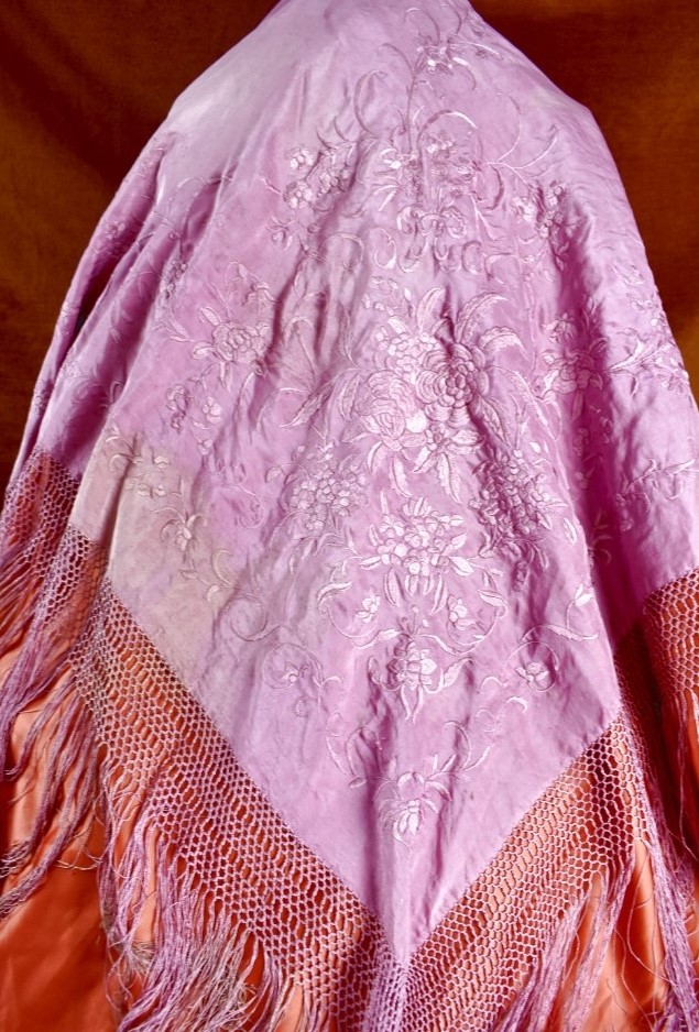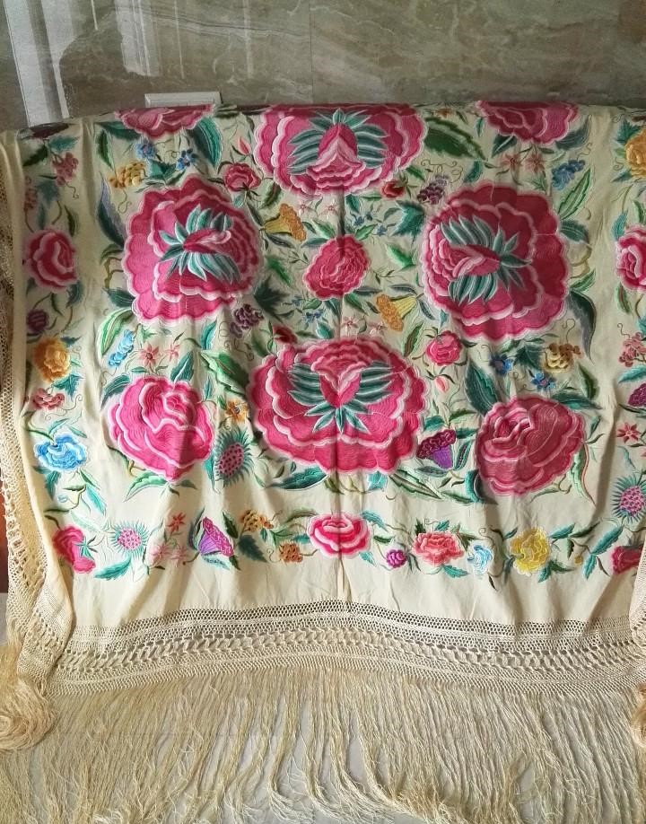 Espectacular Mantón de Manila isabelino de seda muy antiguo